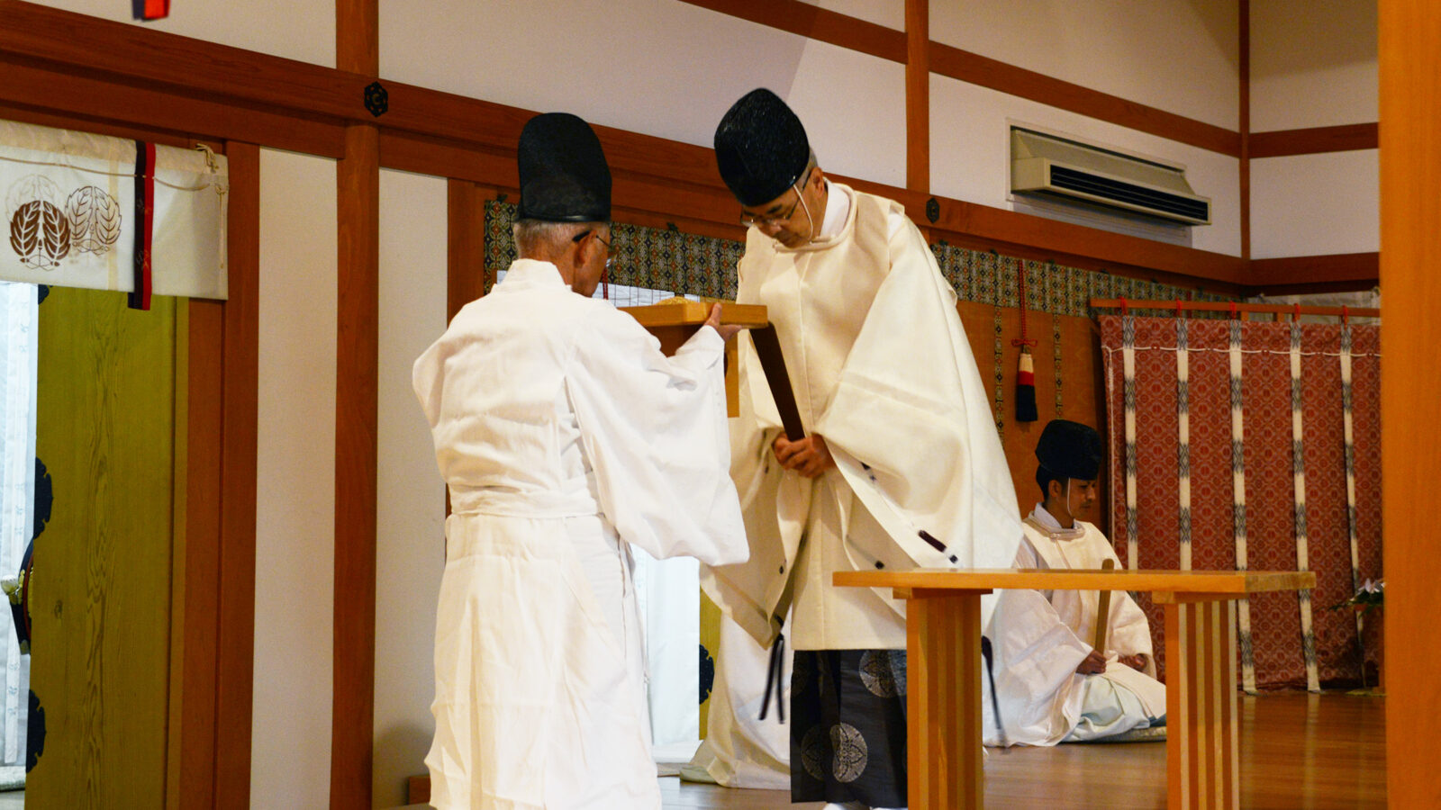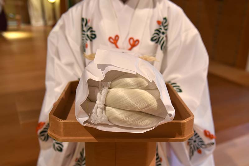 愛知県田原市の神宮神御衣御料所で紡がれた絹糸「三河赤引糸(みかわあかびきいと)」を御神前へお供えいたします。