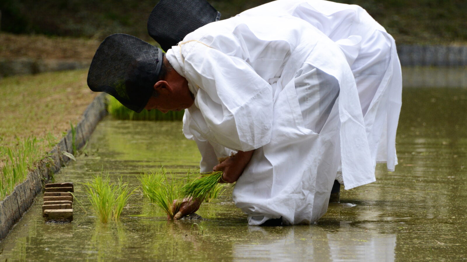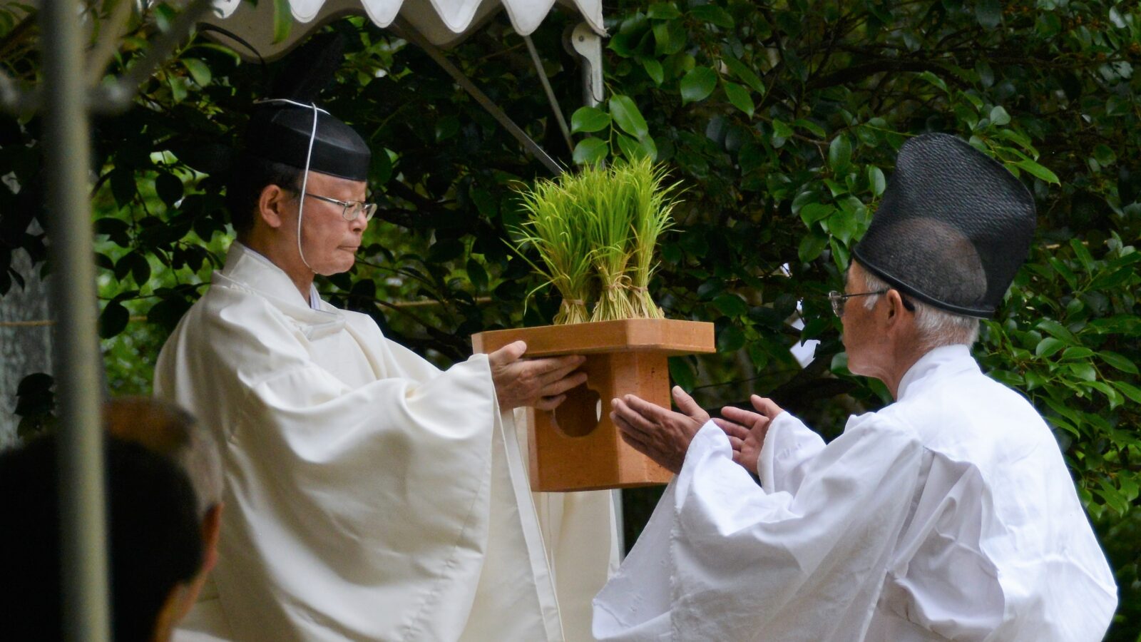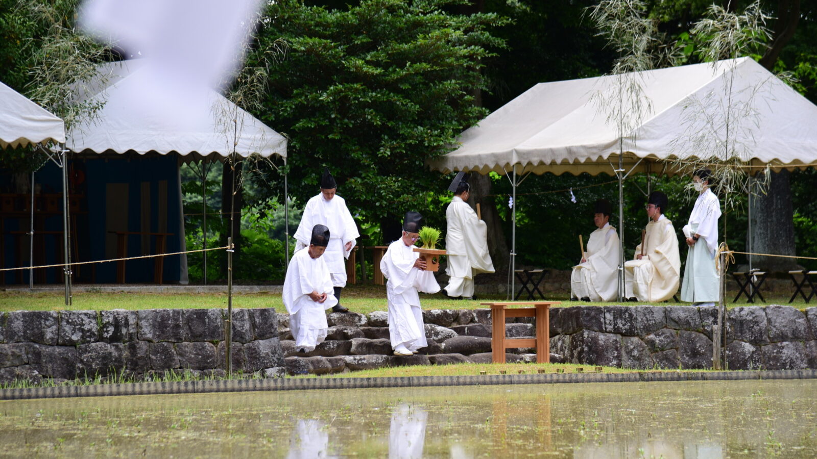 4月に斎行された下種(げしゅ)奉告祭の種から生育した忌苗(いみなえ/罪穢れのない清浄な苗)を神饌田(しんせんでん)に植え、五穀豊穣を祈願いたします。