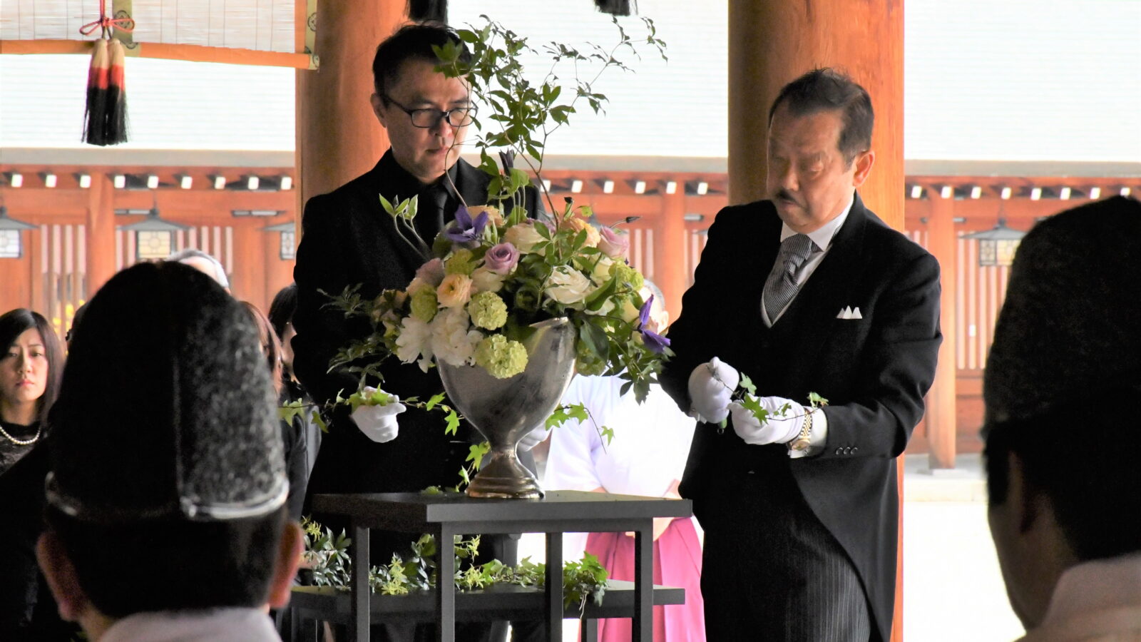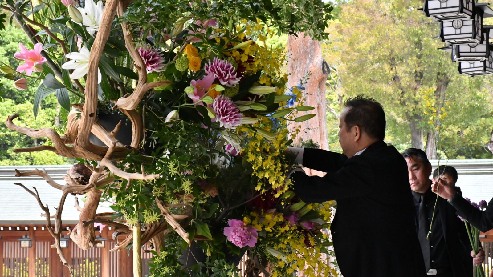 [内拝殿での祭典終了後、場所を外拝殿へ移して別の献華を行います。] ◎献華作品は、祭典後外拝殿にて御覧いただけます。 |