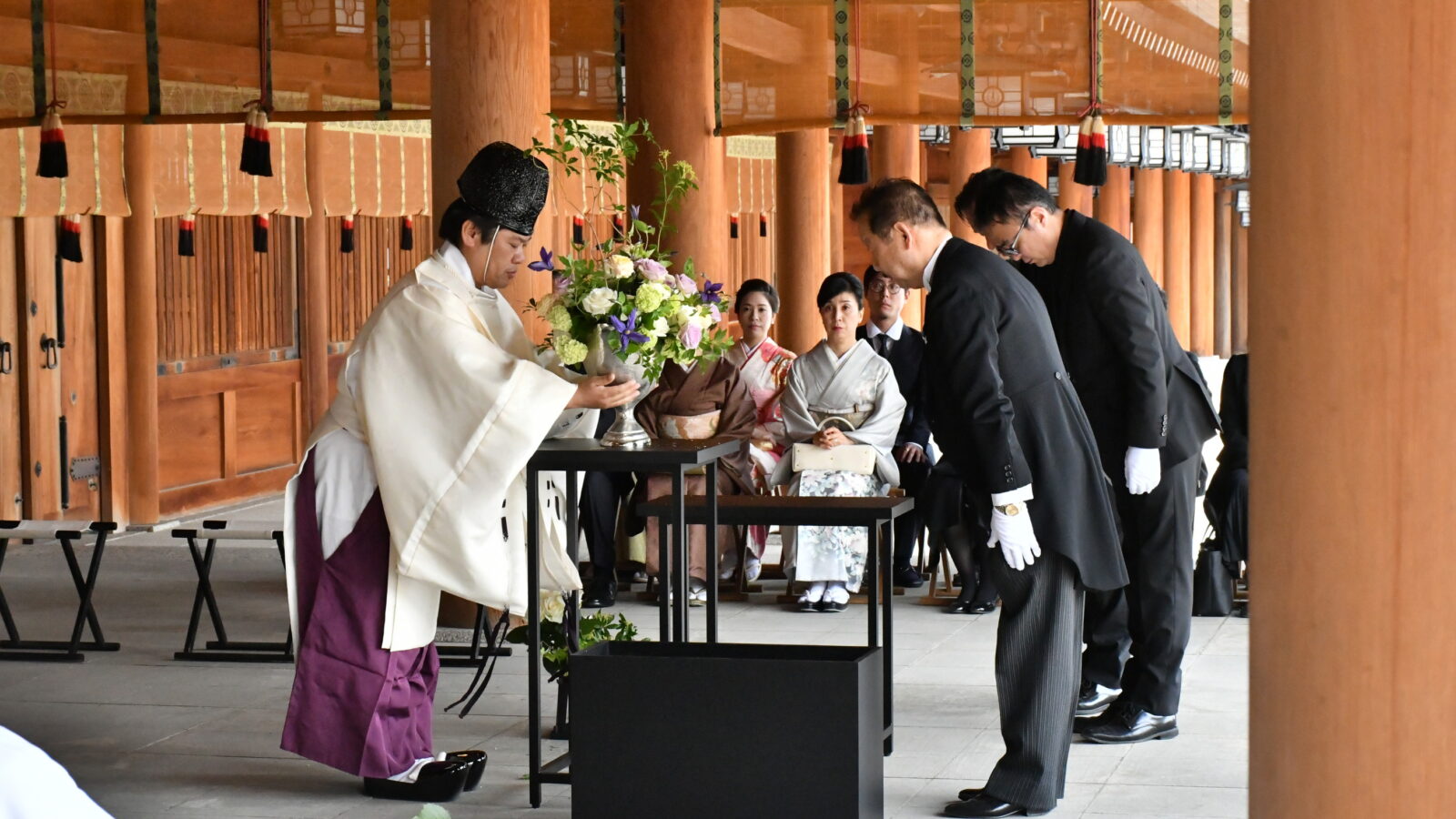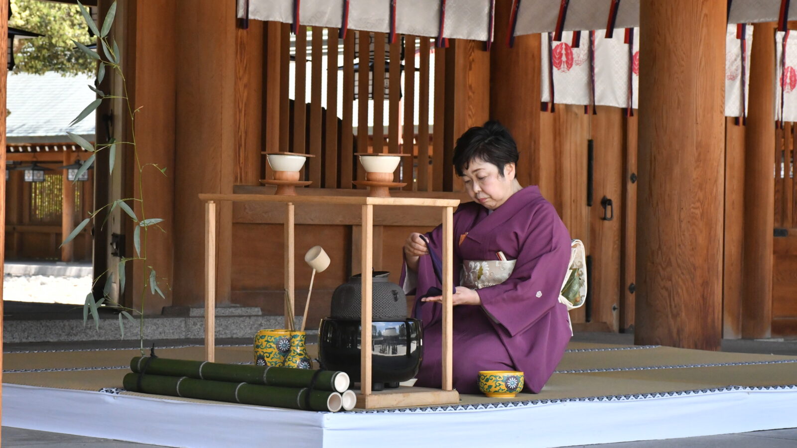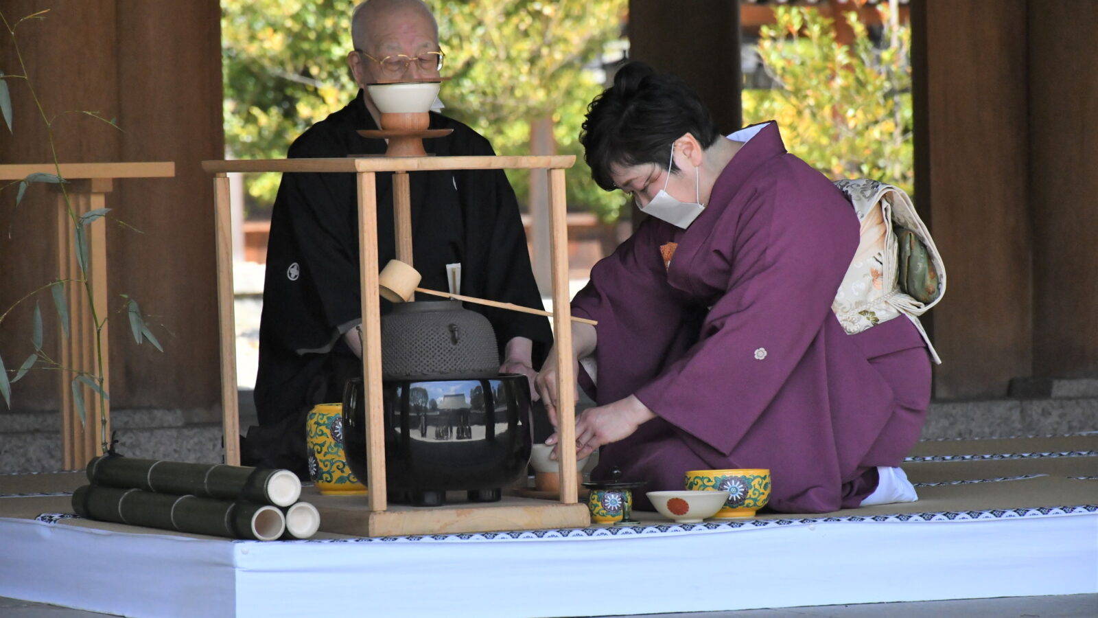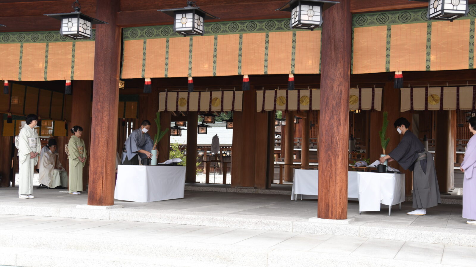 令和4年には裏千家家元奉仕による献茶祭が、平成2年(1990)の御鎮座百年奉祝祭以来、32年ぶりに斎行されました。今後、橿原神宮では3年ごとに裏千家奉仕による献茶祭の斎行を予定しております。 |