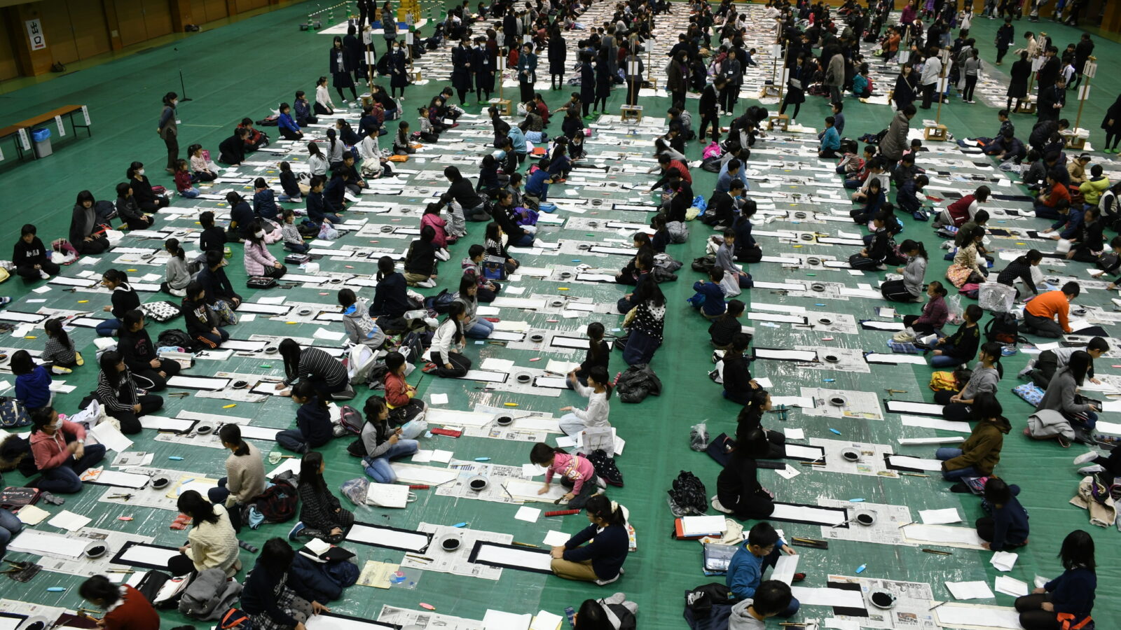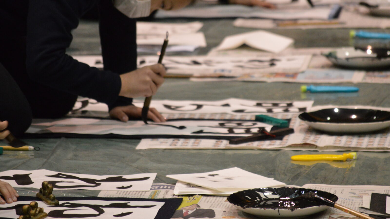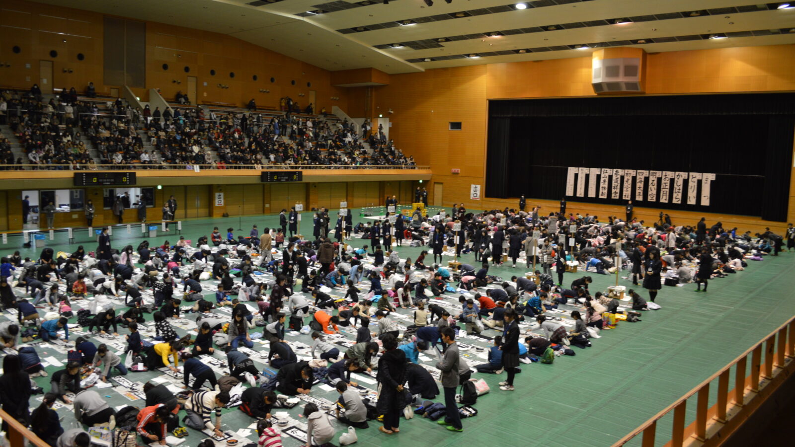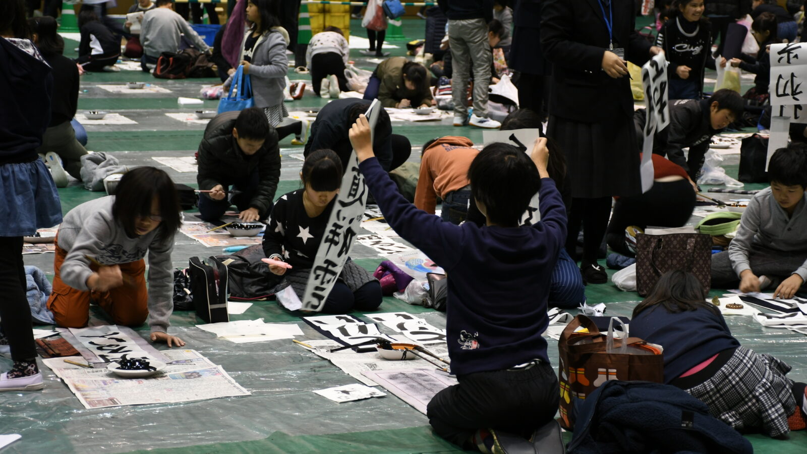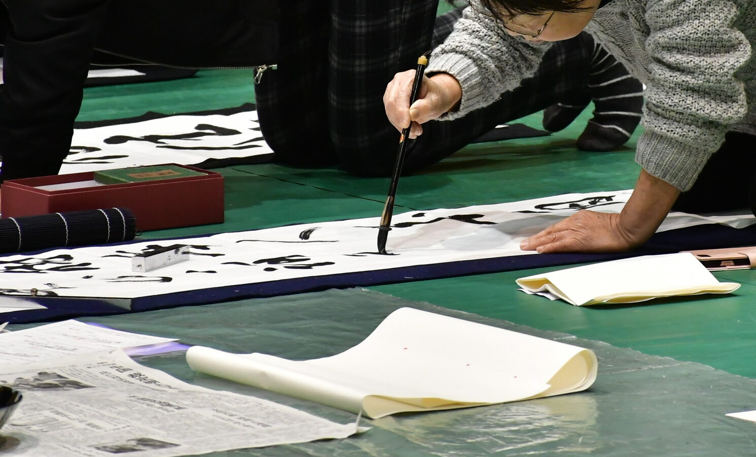 小学生から一般まで約1,600人が参加する県内最大級の席上揮毫書き初め大会。参加者は、用意された2枚の半紙に日ごろの練習成果を発揮して力いっぱい書き上げます。