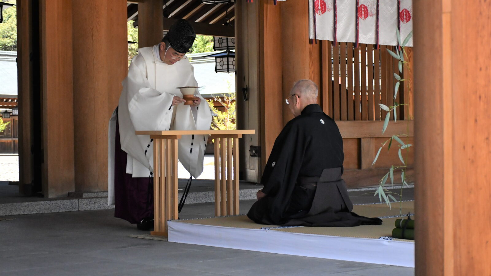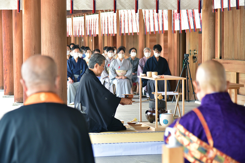 「裏千家献茶祭」では斎主の祝詞奏上後、茶道(ちゃどう)裏千家奉仕により点じられた濃茶・薄茶を神職が御神前にお供えいたします。