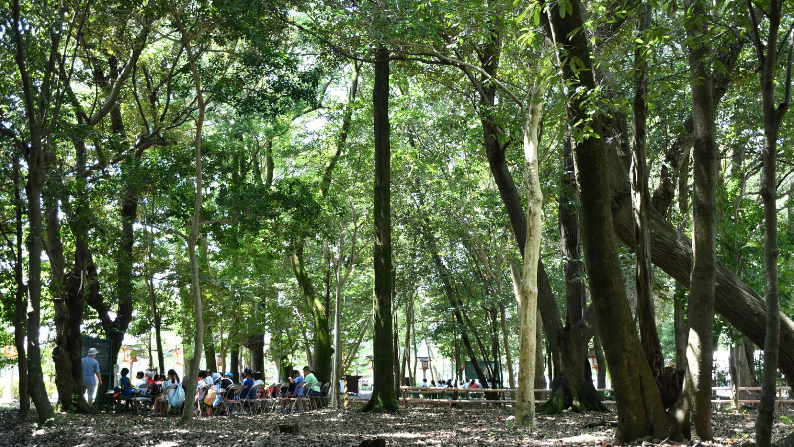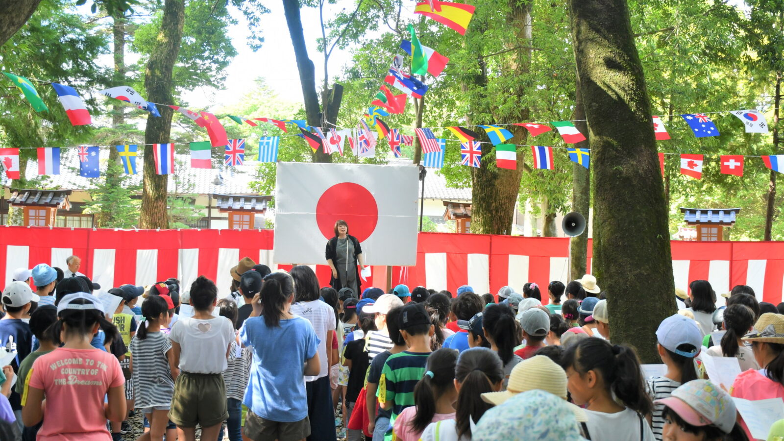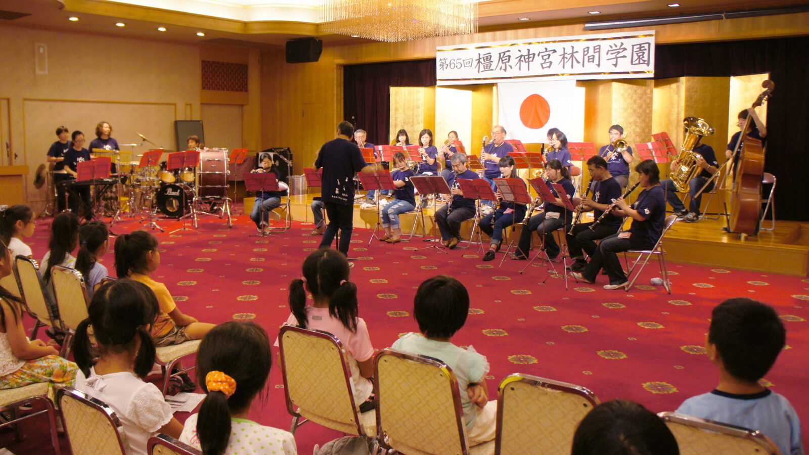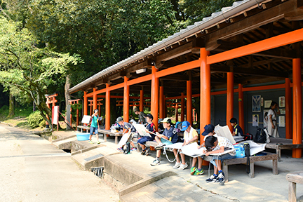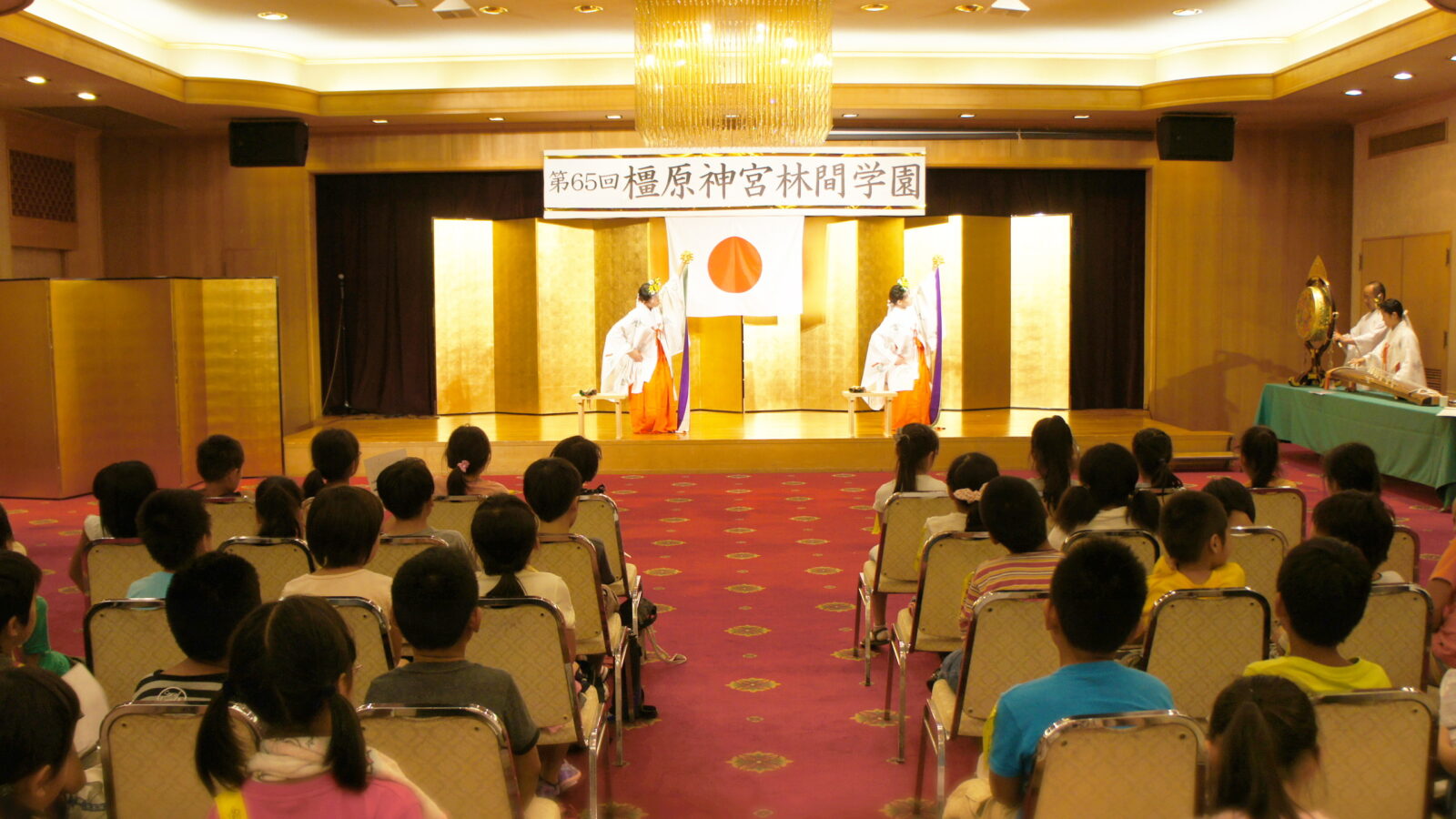 林間学園は、自然豊かな境内が学習の場となり、期間中は希望教科の学習を行うほか、境内の施設見学や、雅楽と神楽舞・吹奏楽の鑑賞など、参加者全員での総合学習も実施いたします。 昭和24年に第1回目を開催し、令和元年には70回目を迎えています。 |