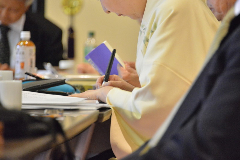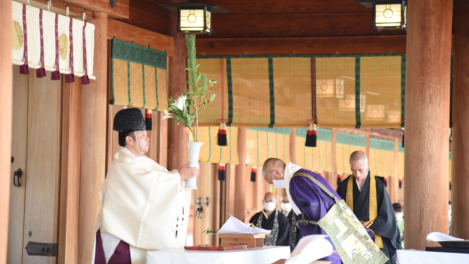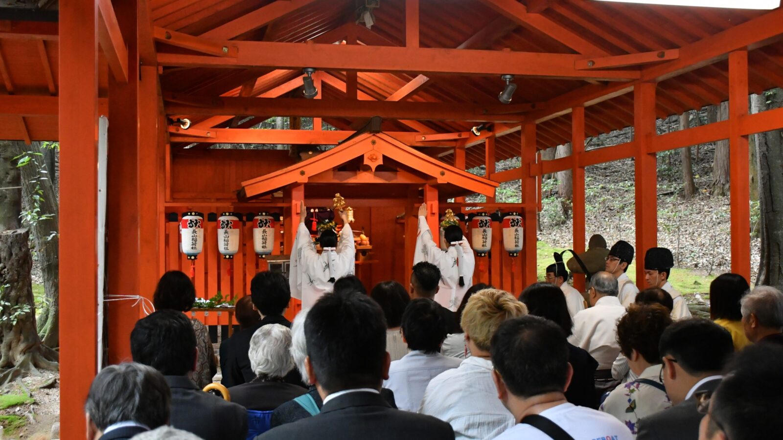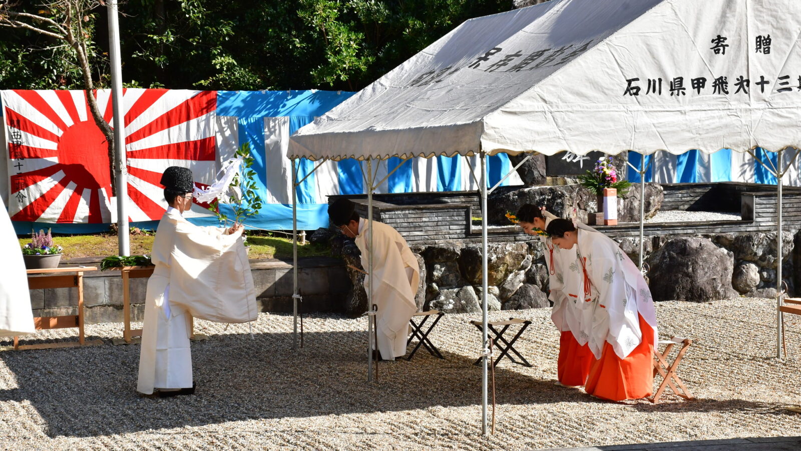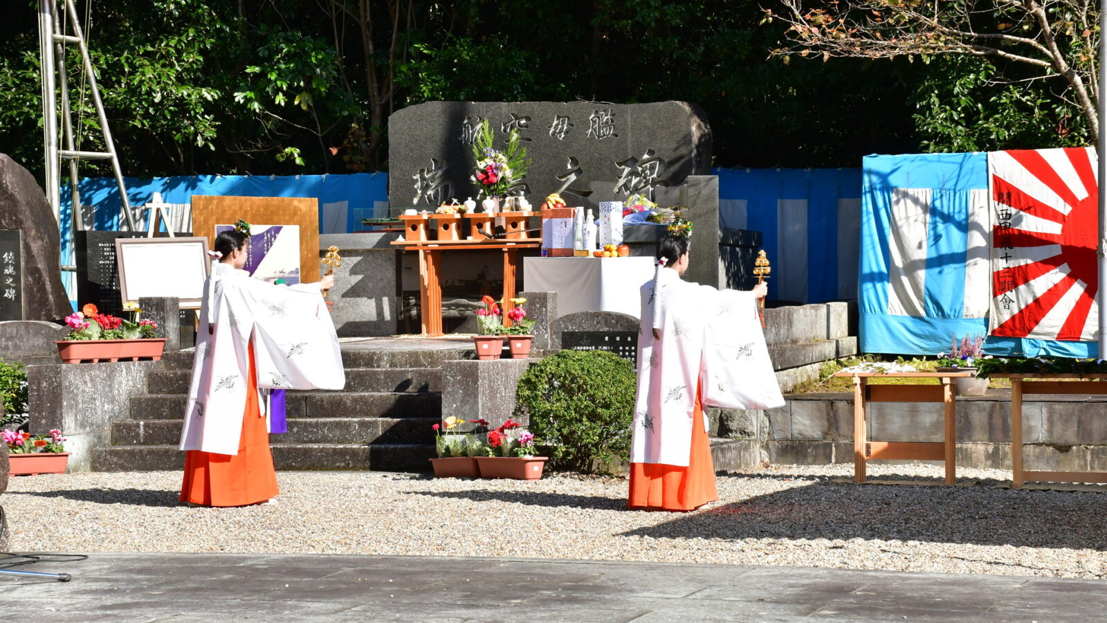 慰霊祭では、斎主による祭詞奏上、巫女による神楽「浦安の舞」の奉奏後、瑞鶴沈没に至る当時の様子を回想した元乗組員の音声が披露され、瑞鶴が沈没した午後2時14分にあわせ、英霊に黙祷を捧げます。 |
