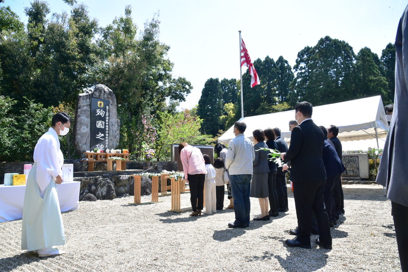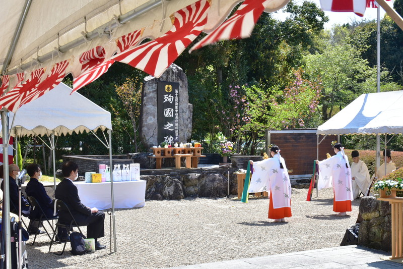 慰霊祭では、斎主の祝詞奏上の後、昭和天皇御製に作曲作舞した神楽「浦安の舞」を奉奏いたします。 「若桜友苑」は、「第十三期海軍甲種飛行予科練習生」、航空母艦「瑞鶴」などの戦没者の英霊を慰める慰霊公苑です。全国の生存同期生その他関係者の志により昭和48年(1973)に「殉國之碑」、昭和56年(1981)に「瑞鶴之碑」が建立され、春にはたくさんの桜が花を咲かせます。 |