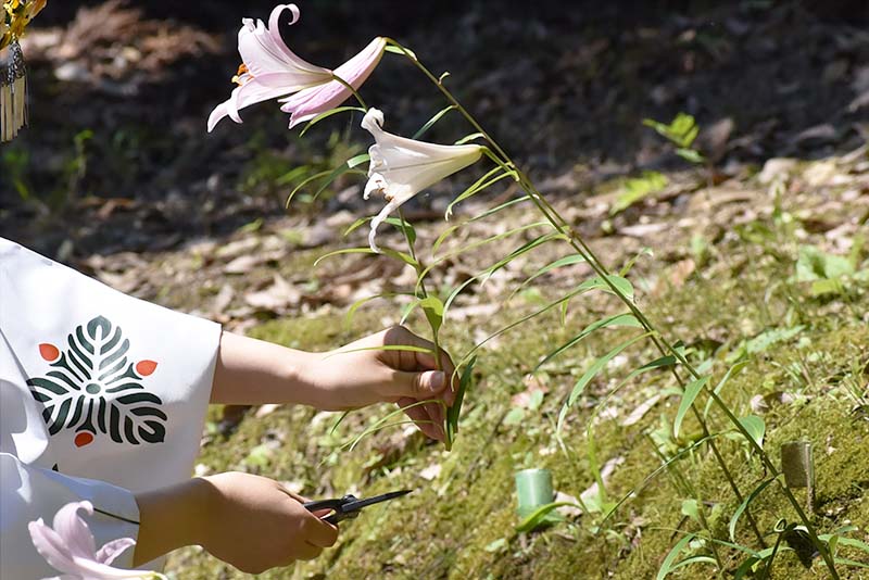 祭典のため、令和3年秋より皇后にゆかりの深いササユリを境内にて栽培しており、当日巫女が摘み取った境内のササユリと、特別に篤志家の方より御奉献いただいたササユリを御神前にお供えいたします。 ◎御神前にお供えされたササユリは、祭典後外拝殿にて御自由に御覧いただけます。 |