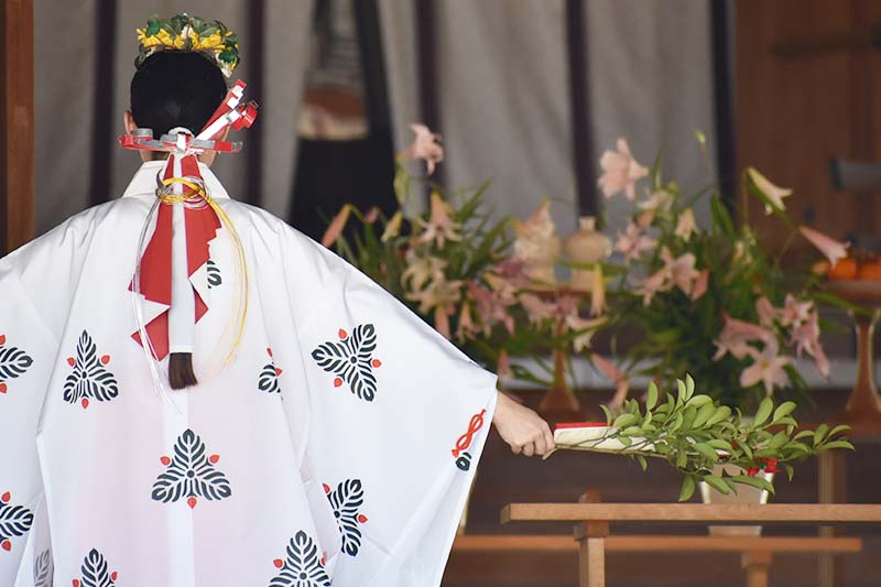神武天皇の皇后である媛蹈韛五十鈴媛皇后(ひめたたらいすずひめこうごう)にゆかりのあるササユリの花を御神前に供え、巫女が「榊舞」を奉奏いたします。