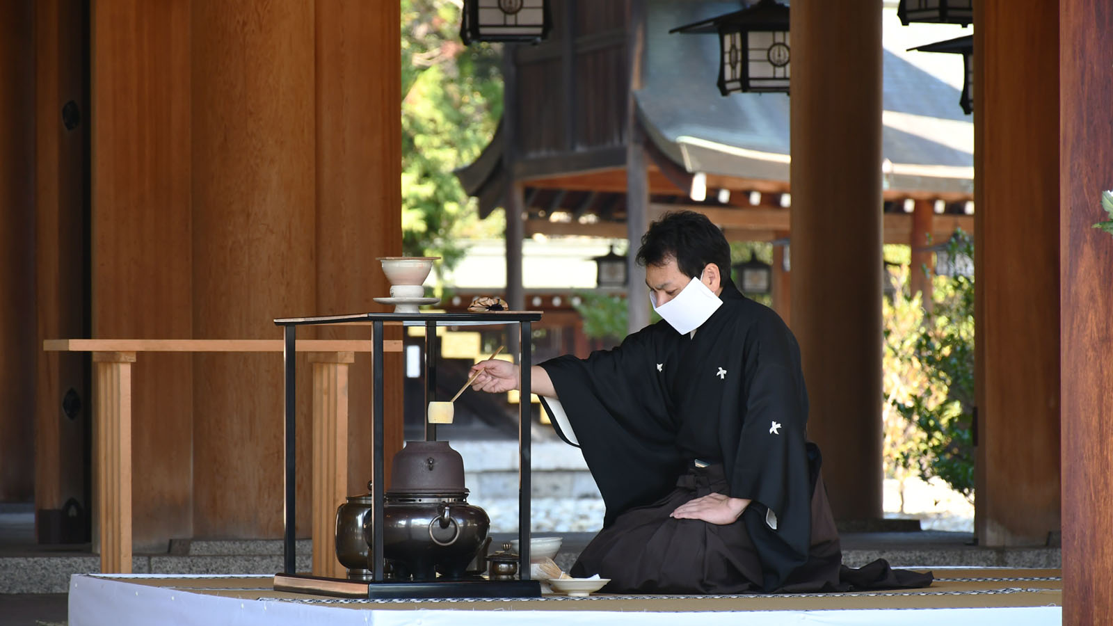 「有楽流献茶祭」はその17代目を務める、有楽流宗家・織田 宗裕(おだ そうゆう)氏の奉仕により執り行われています。祭典では、宗家がお茶を点じ、神職が御神前にお供えします。 |